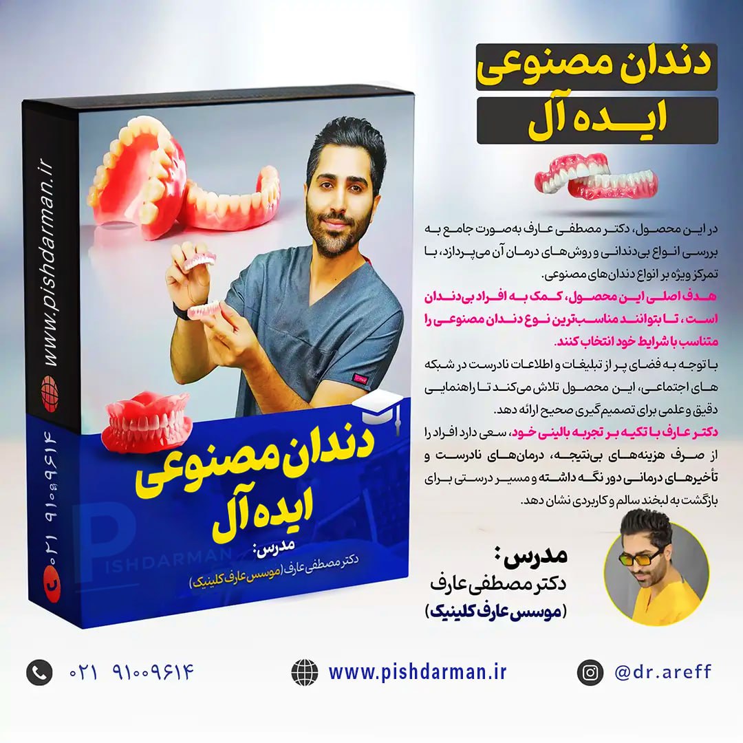 این محصول شامل ویدئوهای آموزشی از دکتر عارف هست . طی این دوره در خصوص انواع بی دندانی ، روش های درمانی و با تمرکز بر روی انواع دندان های مصنوعی توضیحات کامل و جامعی ارائه می شود. هدف اصلی دوره آن است تا به افراد کمک کند بتوانند بهترین دندان مصنوعی مناسب با خودشان را انتخاب کنند، چرا که امروزه در فضای مجازی تشخیص اطلاعات اصیل از انواع تبلیغاتی کار ساده ای نیست.